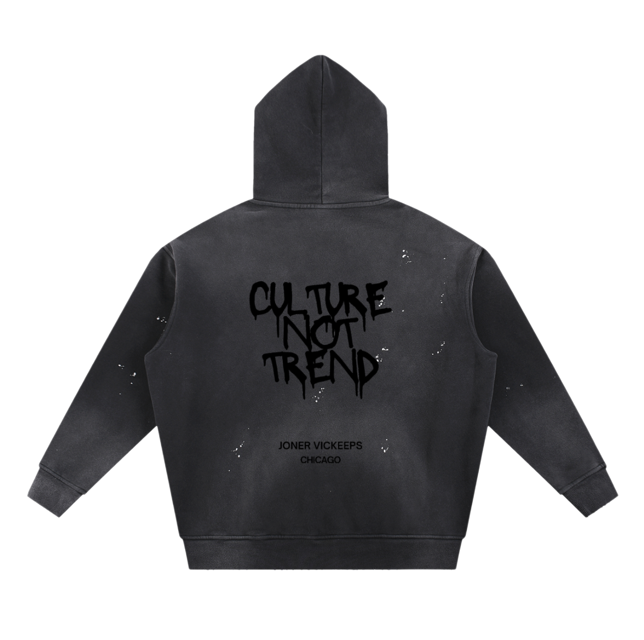 Make a statement without saying a word. The Culture Not Trend Hoodie blends streetwear attitude with meaningful expression. Designed in a washed charcoal black, this hoodie features bold graffiti-style lettering across the back and subtle distressing for an authentic, worn-in aesthetic. Crafted from thick, high-quality fleece, it delivers both comfort and durability.
